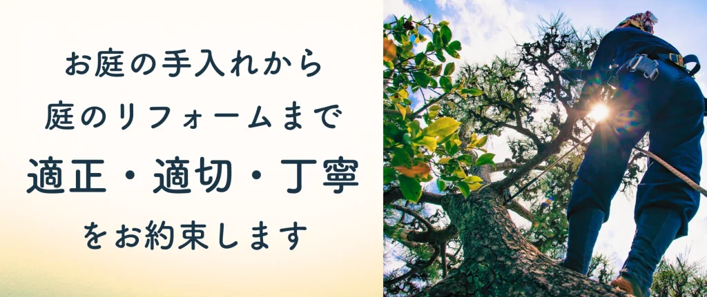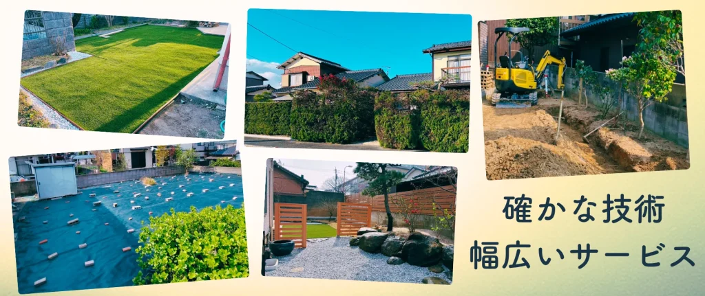 当社では庭木の剪定や伐採、抜根、草刈り、除草、芝張り、人工芝施工、外構工事、庭のリフォームまで、幅広い施工に対応しています。お庭の手入れだけでなく、玄関アプローチ・フェンス・駐車場など、暮らしを便利に美しくする外構工事も承っています。