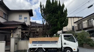2025年10月28日 北九州市門司区北九州市門司区のお客様から、塀を押して大きくなりすぎたカイヅカイブキの伐採をご依頼いただきました。木のすぐ下には波板屋根があり、枝を落とす角度を誤ると屋根を傷つける恐れがあったため、巣登り作業にて枝を一...